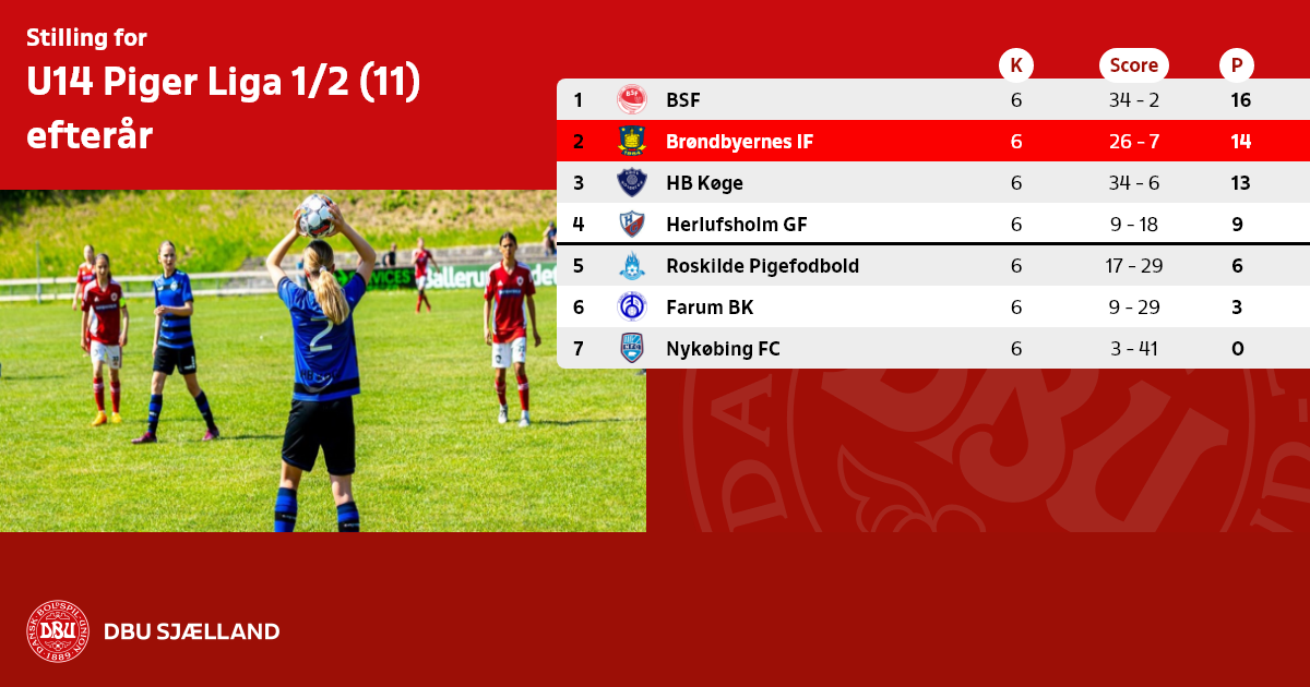 U14 Pige Liga 1/2 afvikles som enkeltturnering med en indledende turnering på syv kampe og et slutspil med tre kampe.