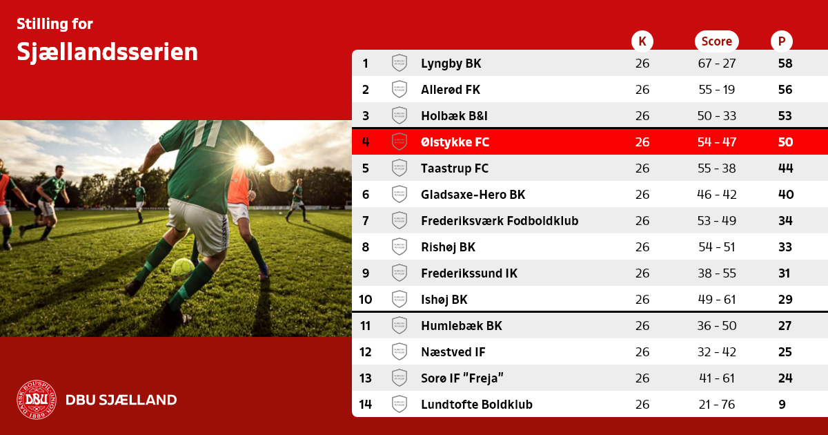 Husk kampnr. (”info” pågældende kamp) ved fejl m.v. Turneringsbestemmelser…. Sjællandsserien. ANTAL HOLD/PULJER: 14 hold i 1 pulje. TURNERINGSFORM: Helårlig dobbeltturnering. PULJEINDDELING: Kun én pulje. HOLDENE: Overførte Sjællandsseriehold, eventuelle nedrykkere fra Kvalifikationsrækken og oprykkere fra Serie 1. OPRYKNING: Nr. 1 og 2 rykker op i Kvalifikationsrækken, mens nr. 3 deltager i oprykningsspil med hold fra øvrige lokalunioner. NEDRYKNING: Se de forskellige op- og nedrykningstilfælde. TURNERINGSAFSLUTNING: Puljevinderen er Sjællandsmester. ØVRIGE BEMÆRKNINGER: En klub kan kun deltage med ét hold. Klubber, som i efteråret i forvejen har hold i Kvalifikationsrækken/Danmarksserien, er ikke oprykningsberettiget. Selv om en klub er berettiget til at fortsætte i Sjællandsserien, rykker holdet ned i Serie 1 til fordel for Sjællandsseriens højest placerede nedrykker, såfremt klubbens hold i Kvalifikationsrækken rykker ned. POINTLIGHED OG POINTGENNEMSNIT: Se reglerne herom. DOMMERPÅSÆTNING: SBU