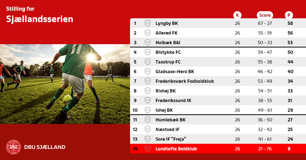 Husk kampnr. (”info” pågældende kamp) ved fejl m.v. Turneringsbestemmelser…. Sjællandsserien. ANTAL HOLD/PULJER: 14 hold i 1 pulje. TURNERINGSFORM: Helårlig dobbeltturnering. PULJEINDDELING: Kun én pulje. HOLDENE: Overførte Sjællandsseriehold, eventuelle nedrykkere fra Kvalifikationsrækken og oprykkere fra Serie 1. OPRYKNING: Nr. 1 og 2 rykker op i Kvalifikationsrækken, mens nr. 3 deltager i oprykningsspil med hold fra øvrige lokalunioner. NEDRYKNING: Se de forskellige op- og nedrykningstilfælde. TURNERINGSAFSLUTNING: Puljevinderen er Sjællandsmester. ØVRIGE BEMÆRKNINGER: En klub kan kun deltage med ét hold. Klubber, som i efteråret i forvejen har hold i Kvalifikationsrækken/Danmarksserien, er ikke oprykningsberettiget. Selv om en klub er berettiget til at fortsætte i Sjællandsserien, rykker holdet ned i Serie 1 til fordel for Sjællandsseriens højest placerede nedrykker, såfremt klubbens hold i Kvalifikationsrækken rykker ned. POINTLIGHED OG POINTGENNEMSNIT: Se reglerne herom. DOMMERPÅSÆTNING: SBU