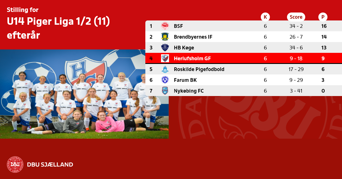 U14 Pige Liga 1/2 afvikles som enkeltturnering med en indledende turnering på syv kampe og et slutspil med tre kampe.